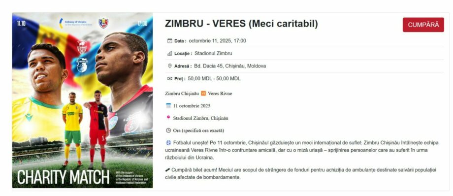 Молдавский футбольный клуб «Зимбру» проведет благотворительный матч с украинской командой «Верес». Все средства, собранные во время матча, будут направлены на приобретение машин скорой помощи для спасения людей, пострадавших из-за военных действий в Украине.