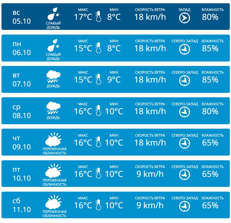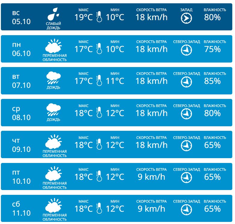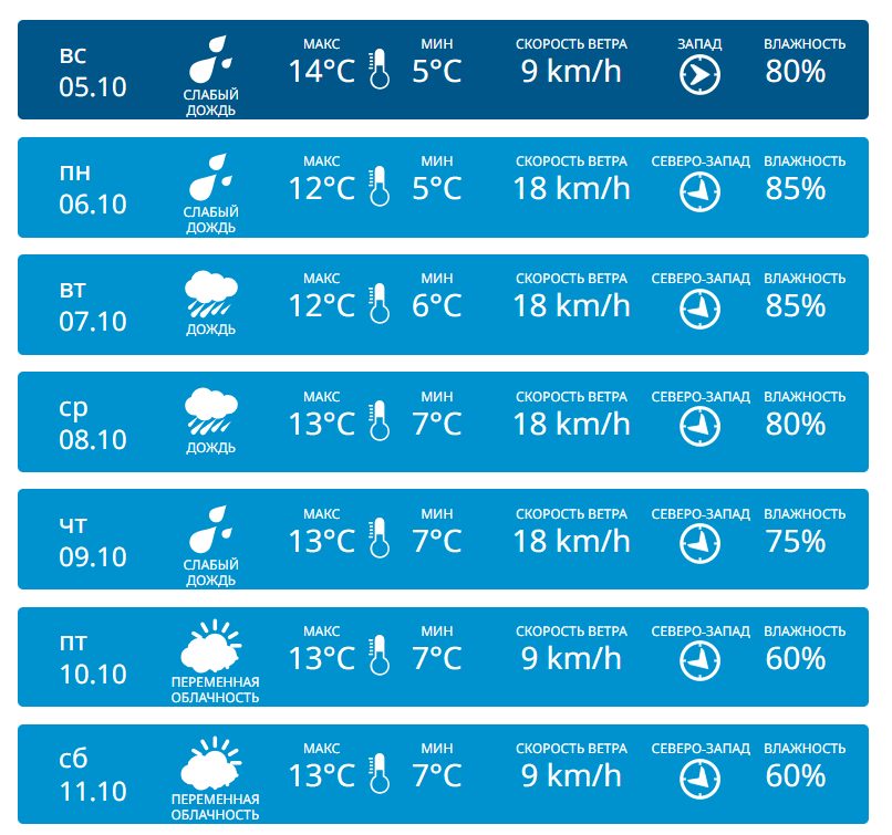 К концу недели погода начнет улучшаться. Влажность воздуха постепенно снизится с 85% до 60%, а ветер станет слабее.