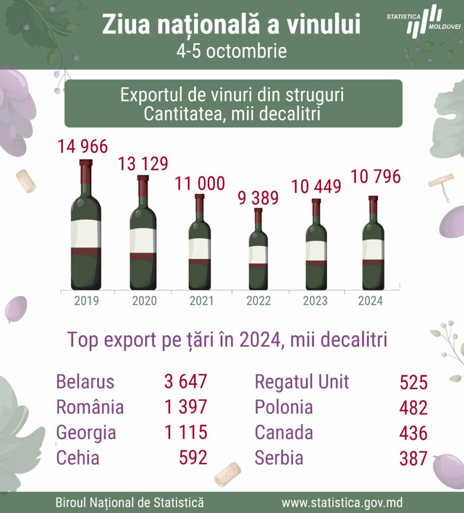 В 2024 году Молдова экспортировала вина на сумму более 135 миллионов долларов. Об этом сообщило Национальное бюро статистики.