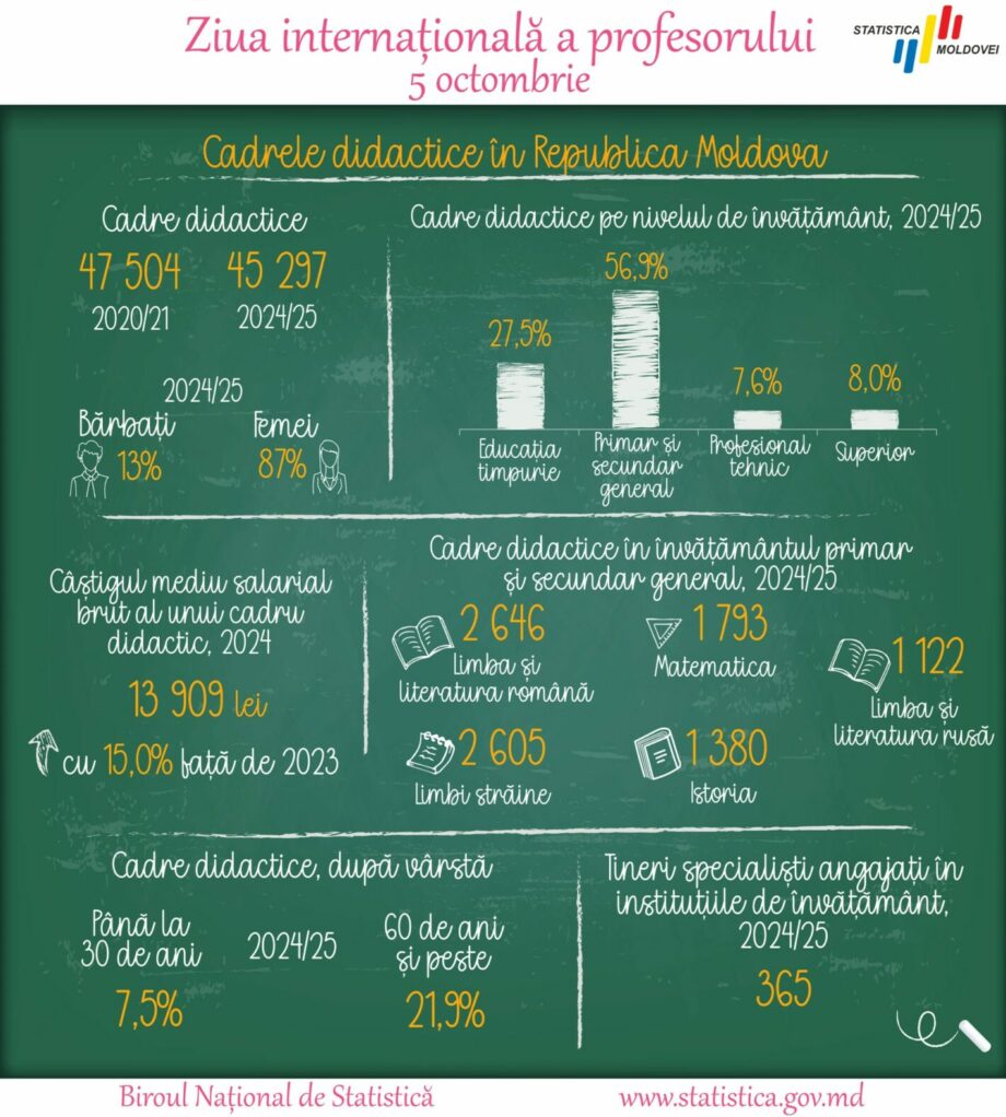 В Молдове женщин-педагогов почти в 7 раз больше, чем мужчин. Так, 2024-2025 годах в сфере образования работало 87 % женщин и 13 % — мужчин. Такие данные представило Национальное бюро статистики.