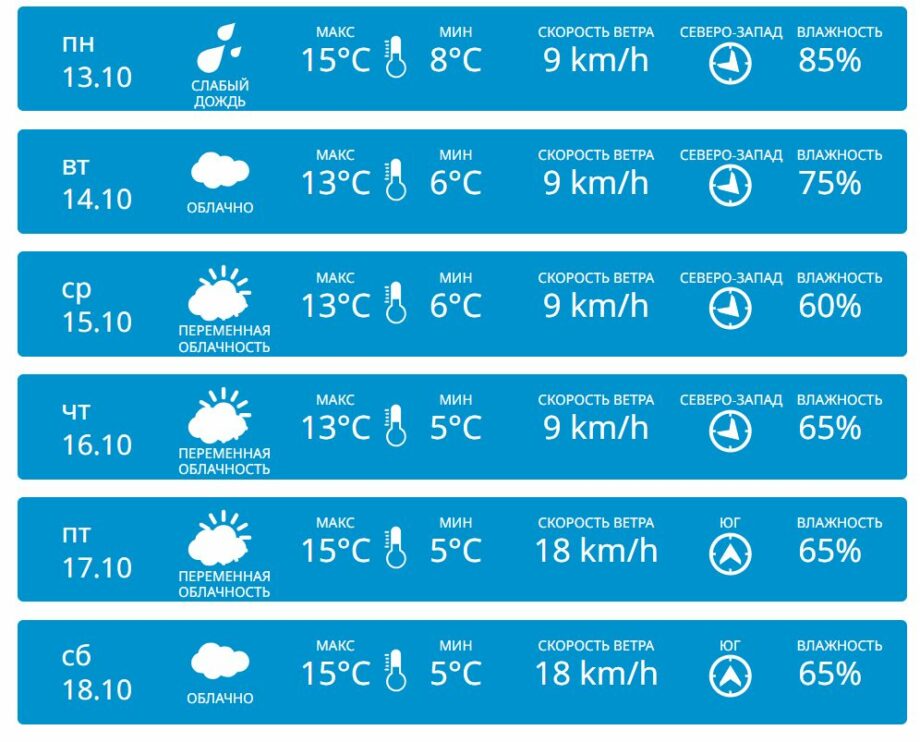 В центральной части страны дождь будет идти только в понедельник. Днем температура составит от +11 до +13 градусов, ночью — от +3 до +6.