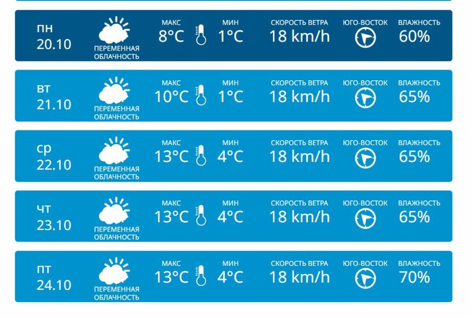 В начале недели (понедельник, 20 октября — вторник, 21 октября): погода будет умеренно теплой. Дневная температура составит от +11 °C в понедельник до +13 °C во вторник. Ночью ожидается около +4 °C. Будет преимущественно солнечно, с переменной облачностью, без осадков.