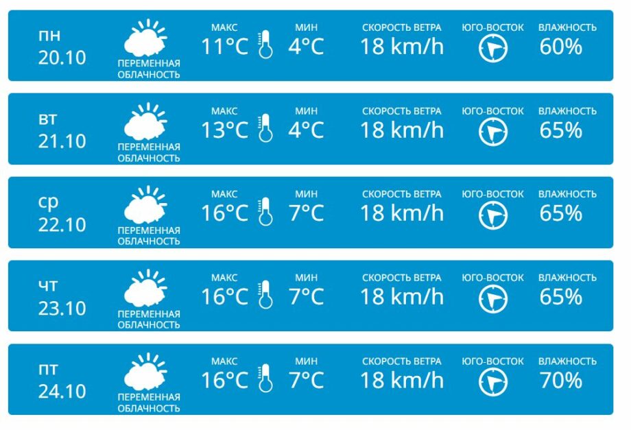 С cередины недели и далее (среда, 22 октября — пятница, 24 октября) начнется заметное потепление, которое сохранится до конца рабочей недели. Днем воздух прогреется до +16 °C, ночью температура не опустится ниже +7 °C.