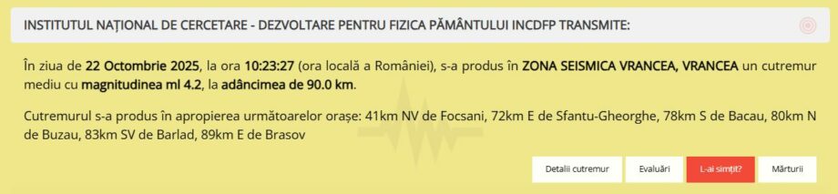 Об этом сообщил Национальный научно-исследовательский институт физики Земли (INCDFP).