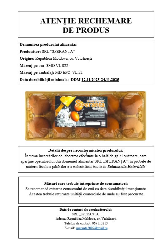 Национальное агентство по безопасности пищевых продуктов (ANSA) отзывает партию яиц производства ООО «Speranța», так как в них обнаружили бактерию Salmonella Enteritidis.