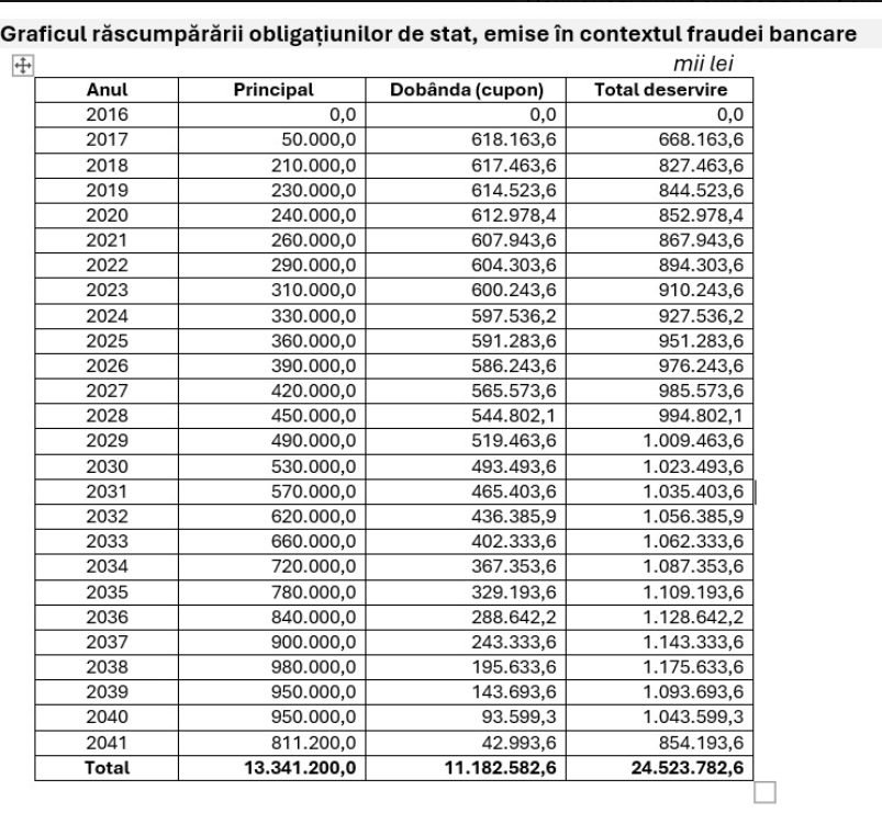 По состоянию на 11 декабря 2025 года государство уже потратило 744,4 млн леев на обслуживание облигаций, выпущенных из-за банковского мошенничества. Из этой суммы 2 280,0 млн леев пошли на погашение самого долга, а 5 464,4 млн леев — на выплату процентов. Только за 2025 год эти расходы составили 951,3 млн леев.