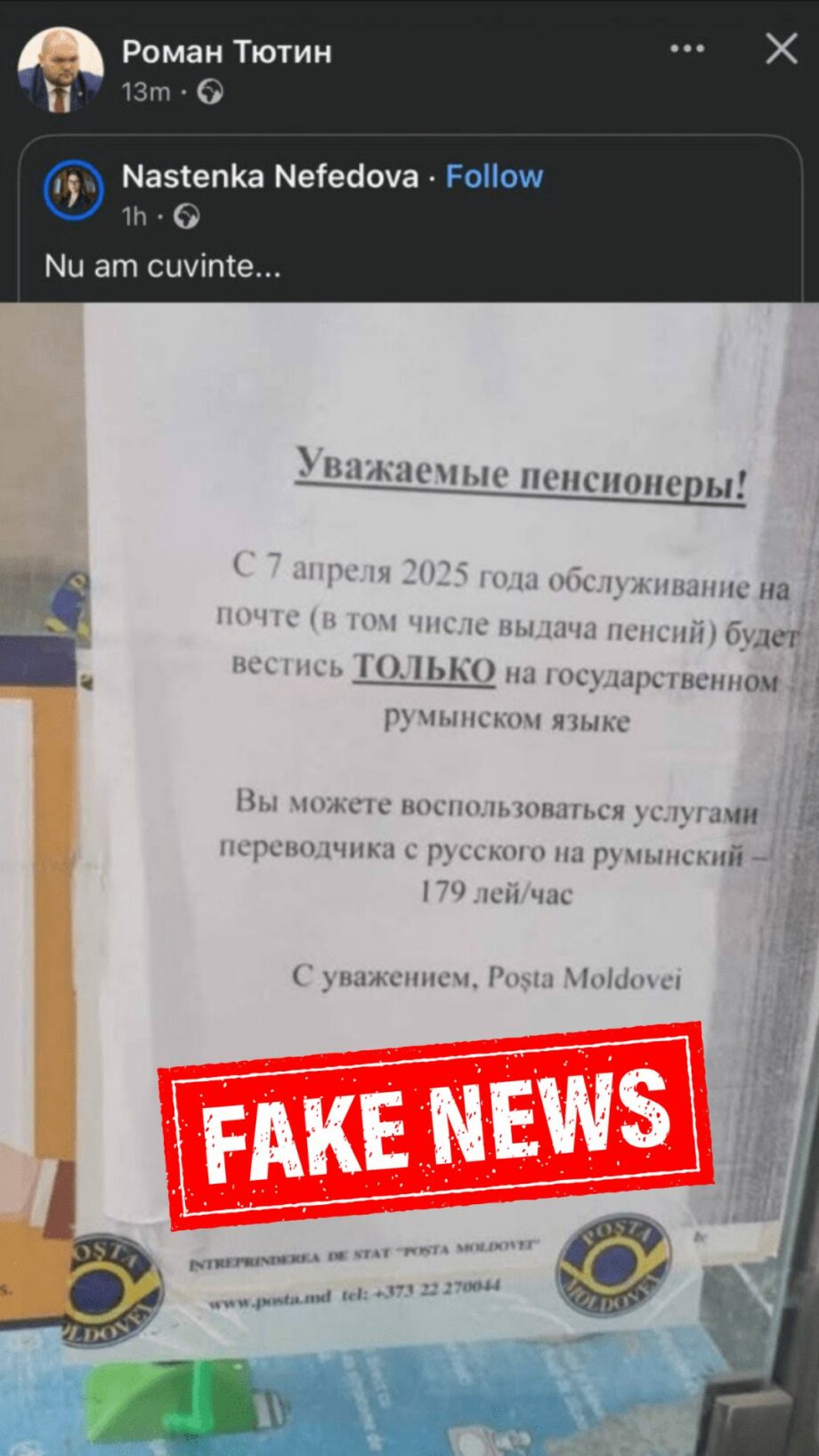 Распространение манипуляционных материалов идет через интернет и соцсети – здесь им предельно удобно придавать ход. Одним из ярких примеров является фейковое объявление якобы на почте: весной 2025 года в Facebook распространили «фото объявления» о том, что Почта Молдовы вводит платные услуги переводчика для пенсионеров и больше не будет обслуживать русскоговорящих клиентов. Министерство транспорта и Агентство «Почта Молдовы» оперативно опровергли это: изображение назвали подделкой, пояснив, что «Почта Молдовы» продолжает бесплатно предоставлять услуги на румынском и региональных языках – русском, гагаузском, украинском и болгарском». Это наглядный пример, как в сети могут появляться графические фейки, рассчитанные на усиление недоверия и страха.