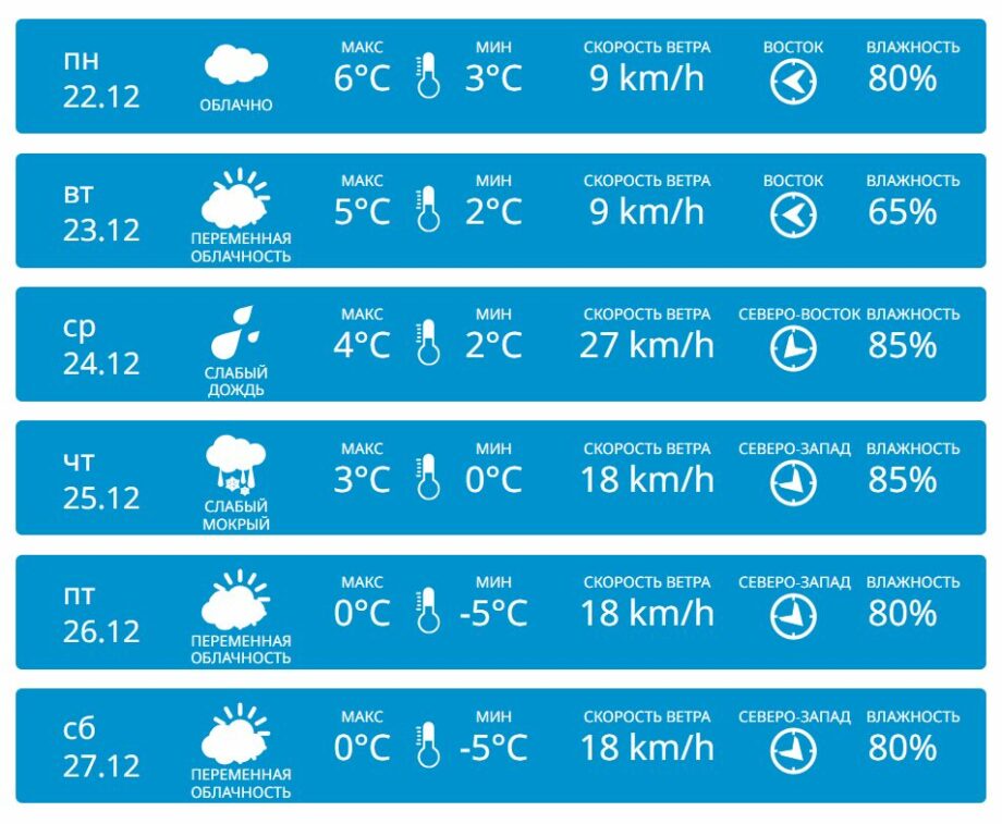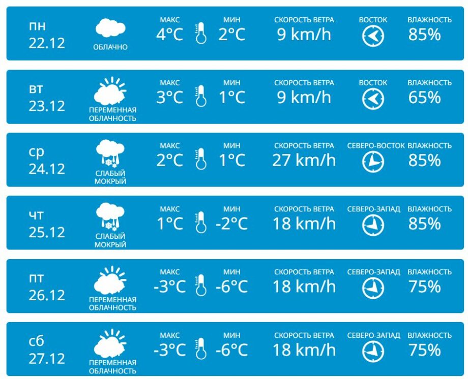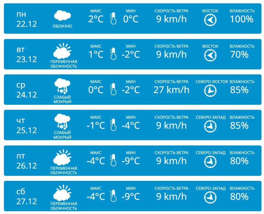 В центральной части республики в начале недели будет облачно с температурами до +2… +4 °C днем и -2… +2 °C ночью. В Сочельник и Рождество по новому стилю синоптики прогнозируют слабый мокрый снег с температурами +1… +2 °C. К концу неделю наступит мороз, до -3 °C днем и -6 °C ночью.