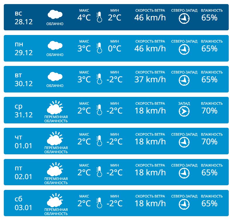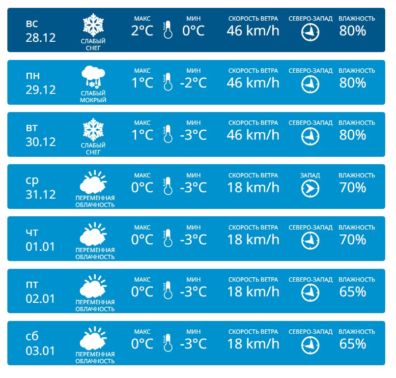 На севере страны неделя начнется со слабого снега и отрицательных температур. Днем столбики термометров будут колебаться в пределах −1…−3 °C, а ночью температура может опускаться до −7 °C. В первые дни недели ожидается сильный северо-западный ветер с порывами до 60–65 км/ч, что усилит ощущение холода. К середине недели осадки прекратятся, установится переменная облачность, однако морозные ночи сохранятся.