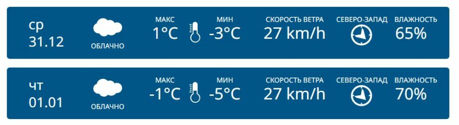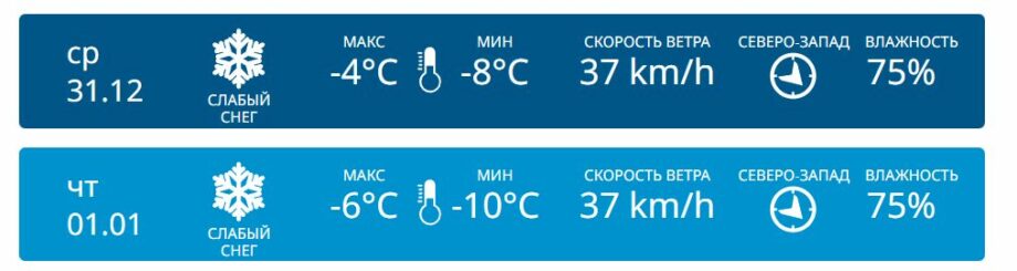 Выходные на севере обещают быть по-настоящему зимними. Согласно прогнозу синоптиков, температурные максимумы днем будут колебаться в пределах от -4 °C в среду (31 декабря) до -3 °C в четверг (1 января). Ночные температуры опустятся от -8 °C до -10 °C. В оба дня прогнозируется мокрый снег под Новый год.